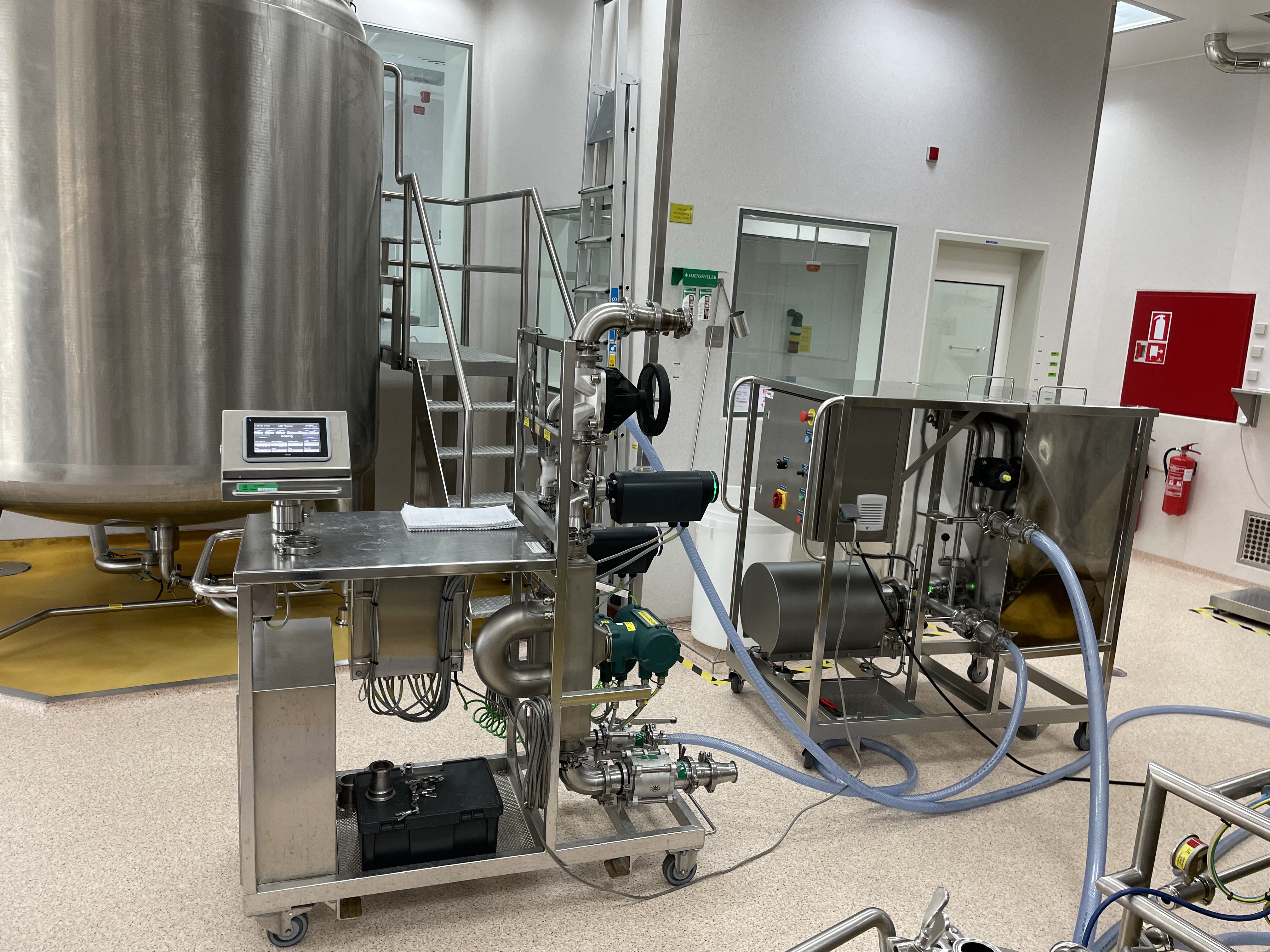 Derfor blev vi spurgt til råds om en ny løsning. Løsningen blev en transportabel flowvogn med styring og frekvensomformer. Løsningen består af et kar med et lukket kredsløb, der sikrer, at pumpen hele tiden kører og forsyner med det rigtige tryk. Derved opnår LEO Pharma en meget lille indsvingningstid på flowhastigheden, og de får samtidig et anlæg, der gør deres teknikere i stand til at udføre flere stabile og mere præcise kalibreringer – på den samme tid som de førhen brugte på blot én kalibrering. Anlægget gør