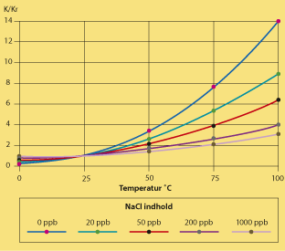 Figur 1. Ledningsevne i vand som funktion af temperatur og koncentration af NaCl sammenholdt med ledningsevne ved 25°C.