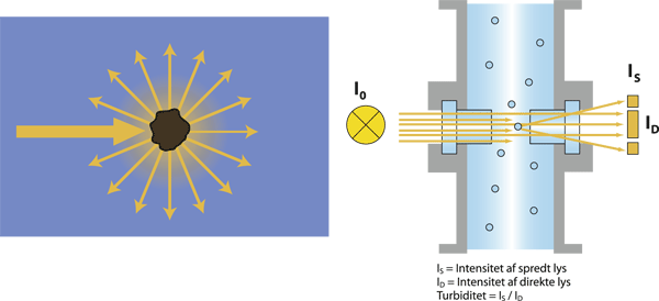 Turbiditet måles ved at sende nær infrarødt lys igennem et medie. Når lyset rammer en partikel i mediet, vil lyset spredes rundt om partiklen i alle retninger. Se Figur 1.
