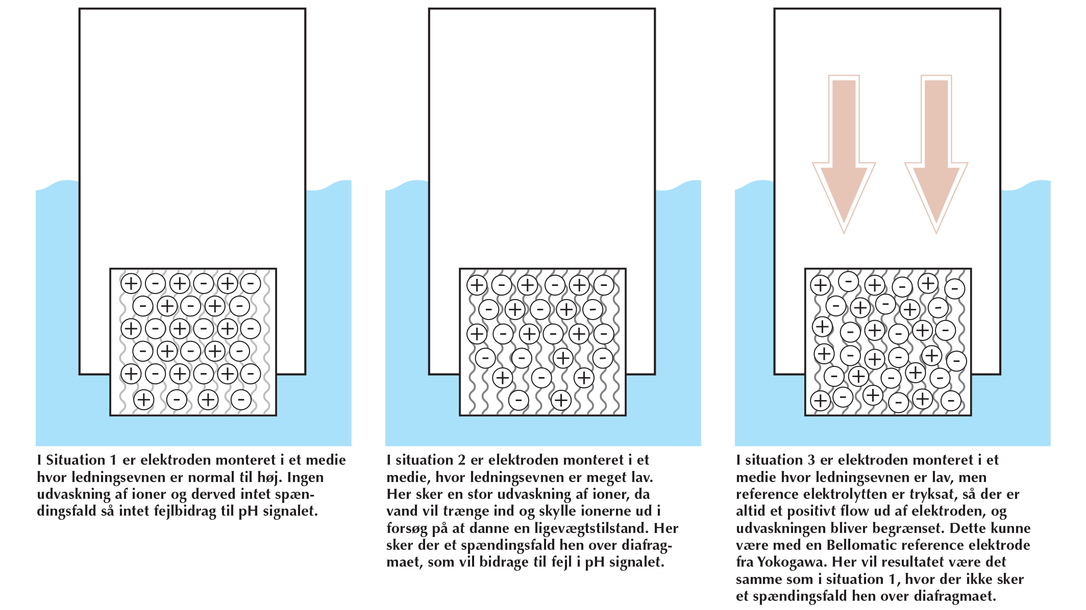 Det vanskelige ved at måle pH og styre en basedosering opstår, fordi ledningsevnen er meget lav, hvilket stiller store krav til pH elektrode og pH transmitter. Da pH elektroden er nedsænket i et medie med lav ledningsevne, vil vandet trænge ind i diafragmaet og skylle nogle af ionerne ud i forsøg på at danne en ligevægtstilstand. Dette betyder at hvis ikke man anvender det korrekte referencesystem, som sikrer at diafragmaet er fyldt med ioner hele tiden, vil spændingsfald hen over diafragma fortolkes af pH transmitteren som et pH signal.