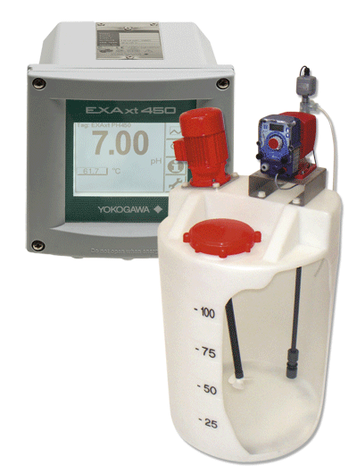 Billedet viser et komplet doseringssystem til syre/base, hvor en Yokogawa pH transmitter og en beholder med pumpe er koblet sammen. Doseringssystemet består af en tank med omrører, der sikrer at syre/base kommer rundt i hele tanken. pH transmitteren styrer doseringspumpen vha. den indbyggede PID-regulator. Denne løsning fås i forskellige størrelser.