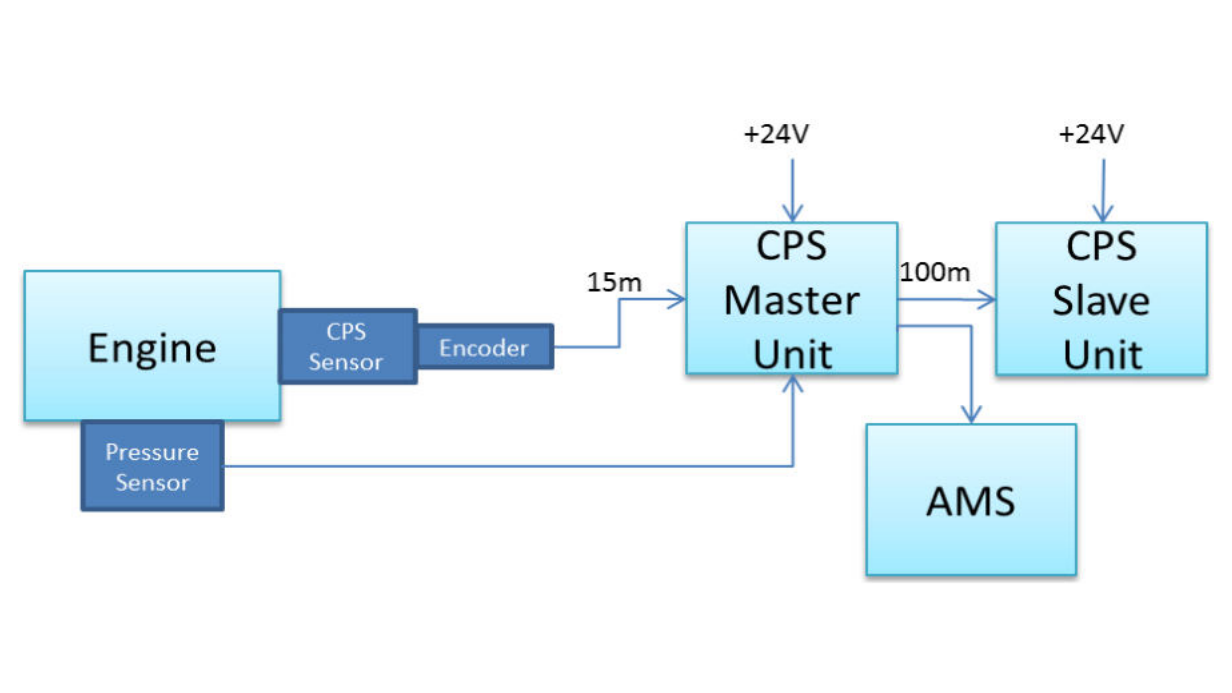 The CPS, along with its optional position encoder and pressure sensor, connects to the CPS Master unit, which calculates and monitors the measured values. Alarm level thresholds are established based on specific engine settings and parameters.