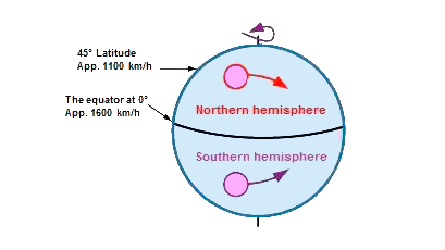To illustrate the Coriolis effect consider earth. Now imagine yourself standing on the equator looking up to the sky at a stationary cloud. At the equator the rotational speed at the surface of earth is approximately 1600 km/h. We will assume the cloud has the equivalent speed. Due to high – and low pressures the cloud moves north to the latitude 45°. Here the rotational speed of the surface is “only” approximately. 1100km/t, hence we have a rotational difference of 500km/h in comparison to the equator. If we ignore frictional loss the cloud still moves at the speed of 1600km/h and it therefore rotates faster than the earth. If the cloud drifted further up to the North Pole, the surface speed would be zero and thus there would be a 1600km/h speed difference between the surface of the earth and the cloud. We would say that the cloud moved relative to the surface of the earth.