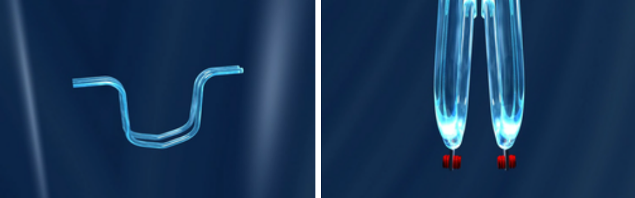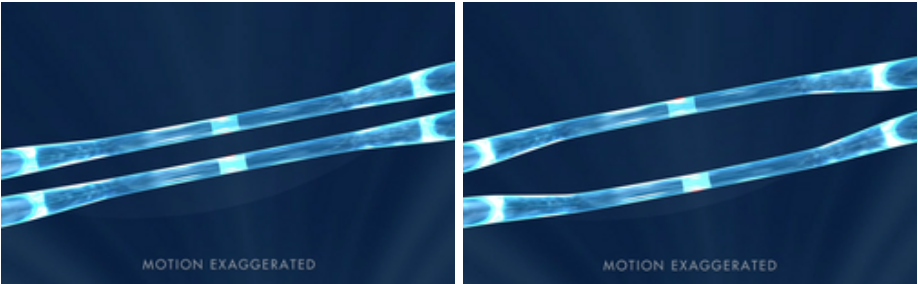 When a medium runs through the tubes (which will excite/move back and forth) the mass of the medium will resist being accelerated into circumference/angular velocity in its way into the tube. Likewise it will resist when the medium is decelerated on its way out of the tubes. The picture (below) shows the measuring tubes being excited back and forth without flow. Notice how the tubes are parallel at no flow conditions.