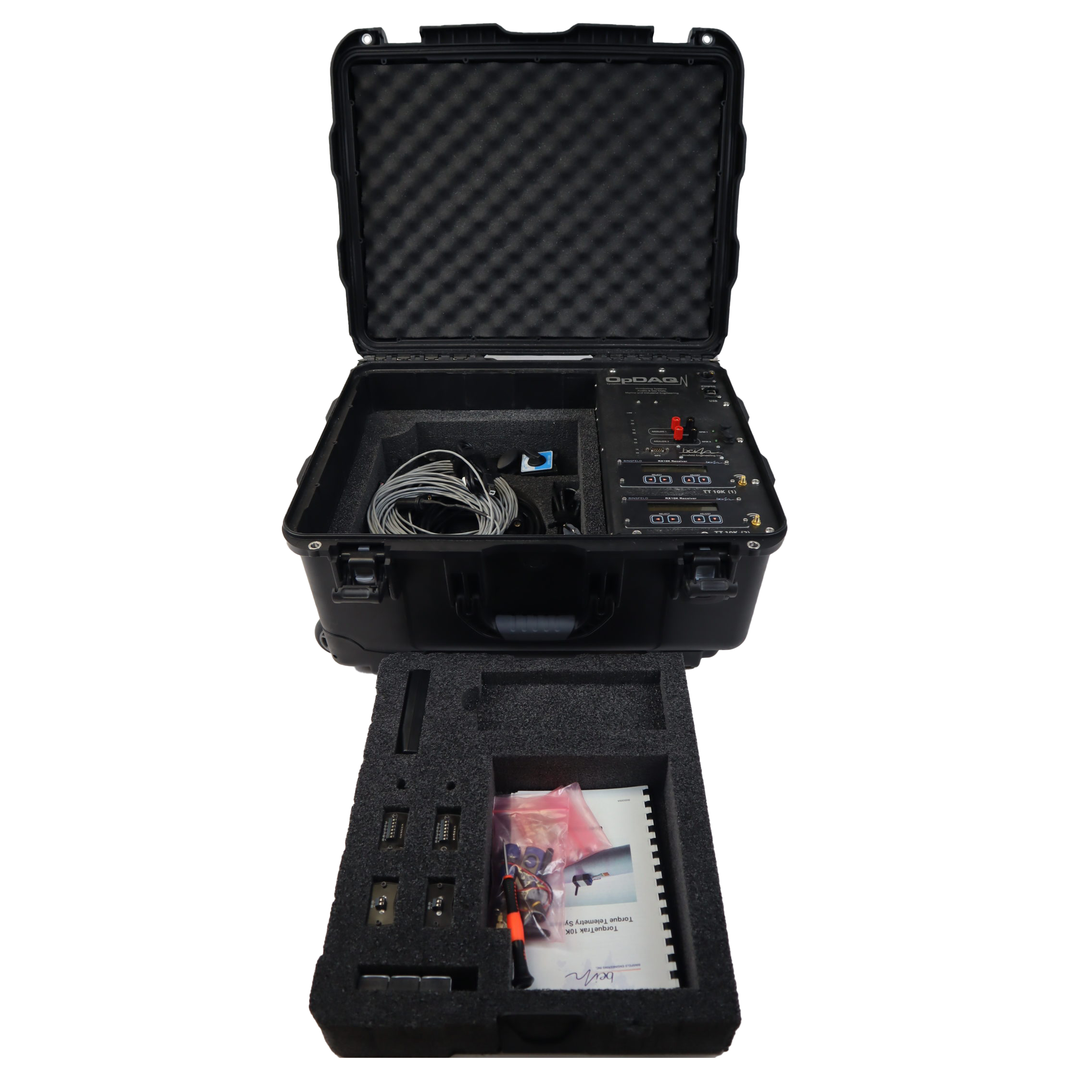 The telemetry units measure the shaft torque and transmit the torque signal to receivers integrated into the carrying case. A pair of TorqueTrak 10K’s are included for simultaneous measurement of two shafts. It also includes 2 standard ±10 VDC analog outputs.