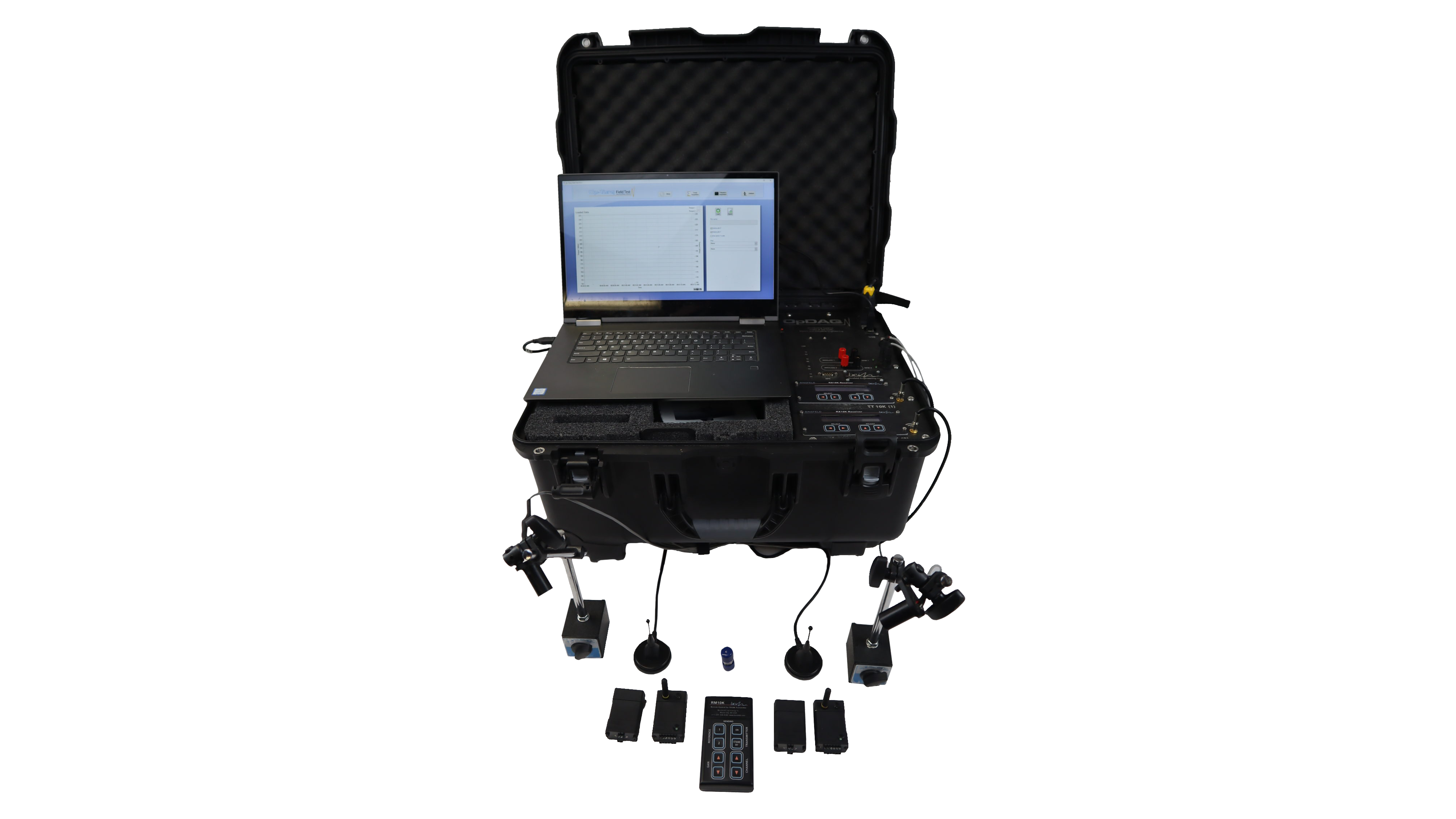 It can measure two channels of shaft speed measurement. The kit includes shaft magnets and a pair of RPM pickups on magnetically-mounted adjustable arms. Pick-ups include 30′ (9 m) of cable that ties in directly to the Field Test 2 integrated in the carrying case.