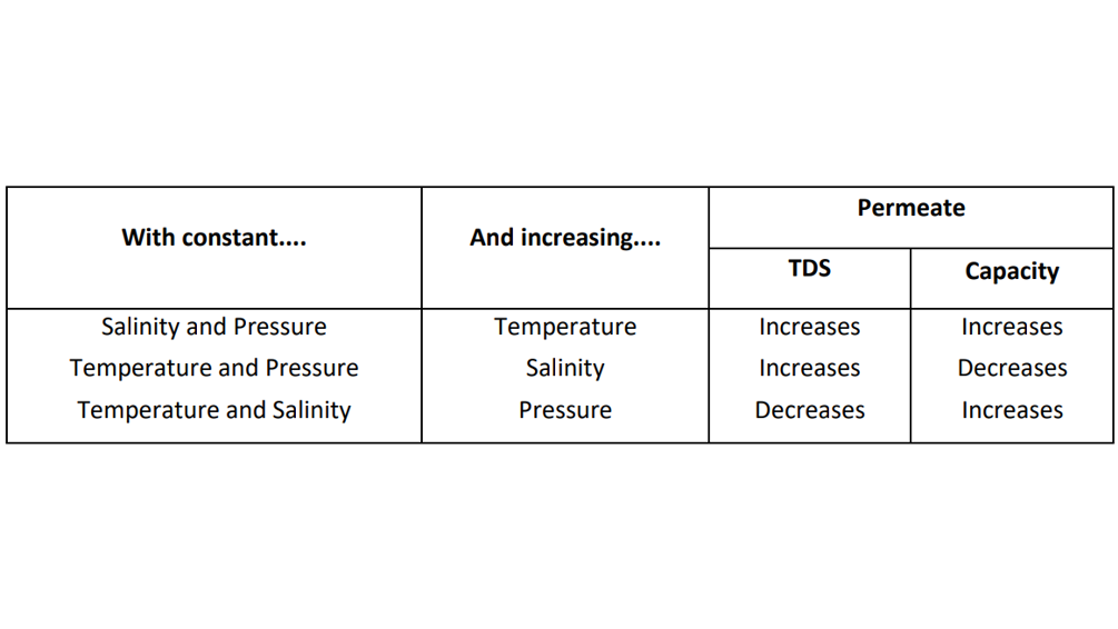 The table below demonstrates how alterations in temperature, salinity, and pressure impact both the quality and quantity of permeate generated by the RO system.