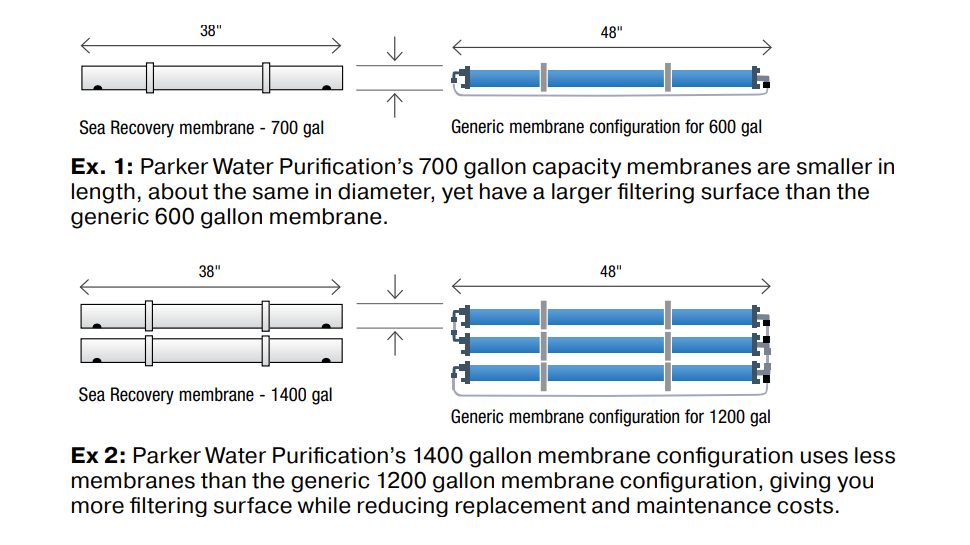 Watermakers from Parker WP generate greater water output per square inch than any other system globally. With high-efficiency membranes, they boast a 17% increase in filtering surface area compared to conventional models, resulting in fewer membranes and installation space needed compared to competitors.