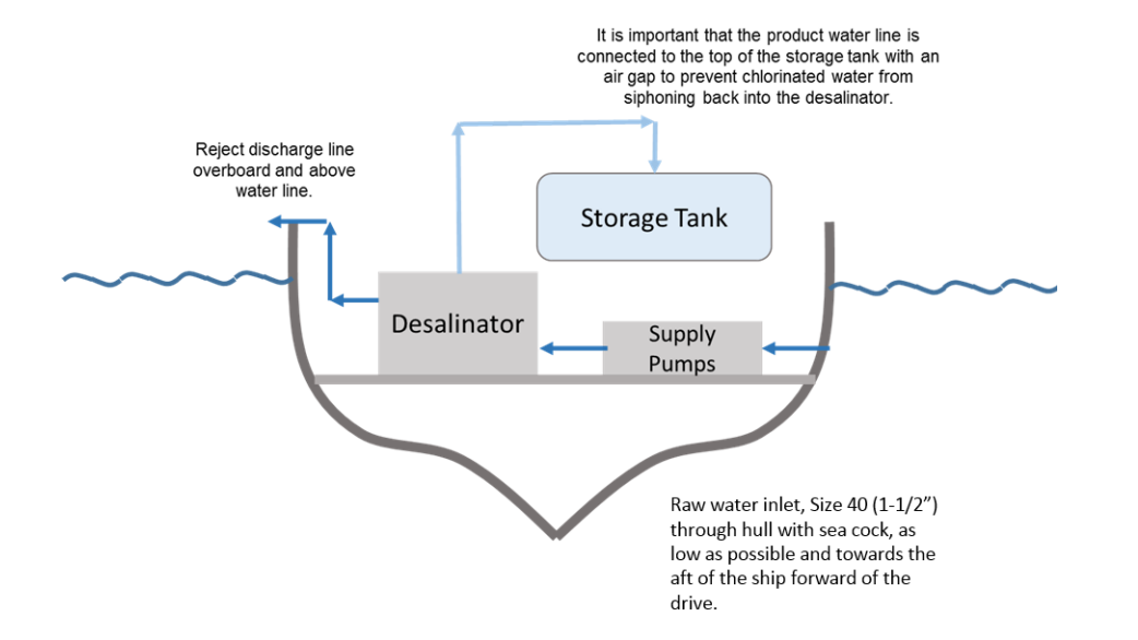 Utilize the ship's onboard water system to deliver fresh water through the FWF Carbon filter, eliminating any chlorine, and into the R.O. System.