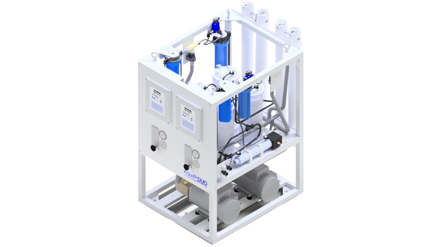 The Aqua2 DUO from Parker Watermakers is a compact, aluminum-framed watermaker providing potable water for drinking and cooking. Quiet, space-efficient, and offering system redundancy and easy installation in tight spaces. Available in capacities from 442 to 1,073 liters per hour.