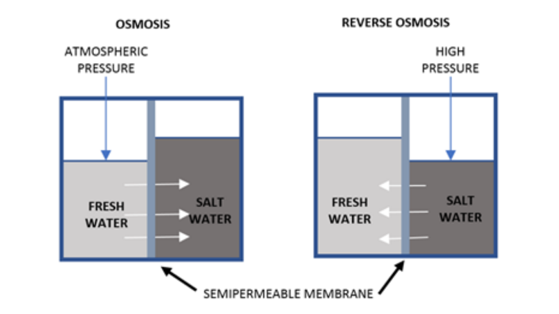 However, if pressure on the concentrated solution exceeds the osmotic pressure, fluid flow reverses. This phenomenon, known as Reverse Osmosis, is achieved by artificially pressurizing the more concentrated solution using a high-pressure pump. In such a system, the concentrated solution (commonly called feedwater) becomes even more concentrated as pure water moves across the membrane to the permeate side.