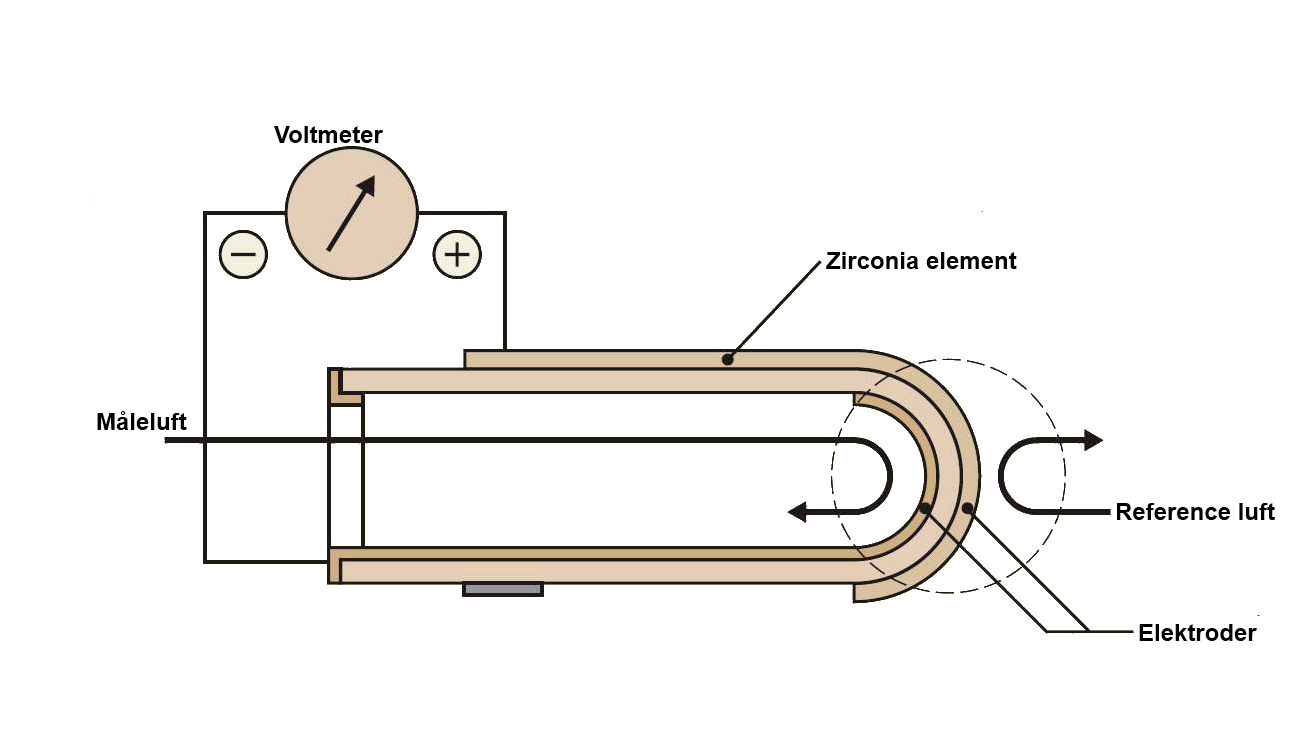 Zirconia sensoren er opbygget af to elektroder - placeret på hver sin side af et zirconiumoxid element, der fungerer som en oxygen permeabel membran.