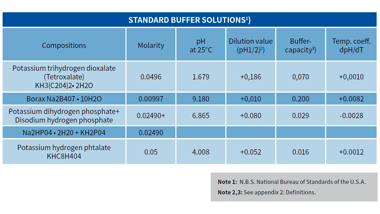 Eksempler på foretrukne buffere fra Yokogawa er vist i tabellen nedenfor. Bufferopløsninger fremstillet af disse stoffer er i overensstemmelse med anbefalingerne fra DIN Standards Committee og National Institute of Standards and Technology (NIST). Stofferne er udvalgt for deres særlige egnethed som kalibreringsstandarder for præcisions-pH-målere.