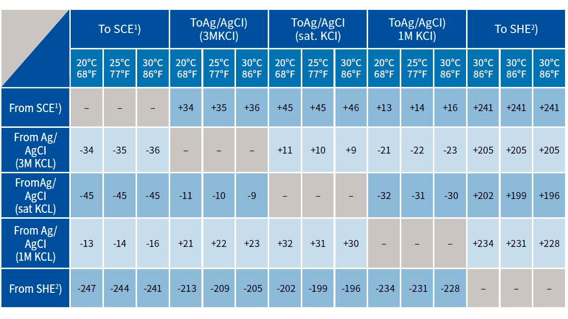Referenceelektroder med forskellige interne fyldløsninger vil have forskellige mV-udgange, når de sættes i den samme standardløsning. Dette skyldes, at standardopløsningen blev fremstillet med én specifik referencepåfyldningsopløsning i tankerne. Tabel nedenfor viser i kolonnen længst til venstre nogle af de mest almindeligt anvendte referenceelektrodefyldningsløsninger. Øverst i tabellen er de mulige referencefyldningsløsninger, som standardopløsningen blev forberedt på. For at bruge nedenstående skema skal du vide, hvilken (1) referenceopløsning der bruges i referenceelektroden og (2) hvilken referenceopløsning den kendte præfabrikerede opløsning sammenlignes med. For eksempel, hvis du har en færdiglavet 250 mV opløsning, der er refereret til SHE (Standard Hydrogen Electrode), og referenceelektroden i din målesløjfe bruger en 1 M KCl fyldopløsning, så på senderen ville du IKKE læse 250 mV, men i stedet ville du kun læse 19 mV ved 25° C. Dette er 250 mV værdien på opløsningen minus 231 mV værdien vist som forskellen mellem SHE og 1M KCl referencerne . Dette ville være 19 mV.