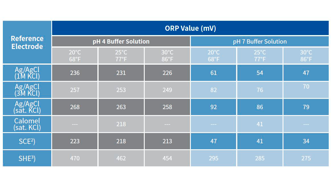 Uanset om det er en 4.0- eller en 7.0-buffer, du bruger, viser tabellen nedenfor den mV-aflæsning, du skal opnå, afhængigt af hvilken referenceelektrode, der bruges. Som et eksempel bør en quinhydron/pH 4,0-opløsning give en 253 mV (± 30 mV) ved 25°C for en referenceelektrode, der har 3M KCl intern fyldning.