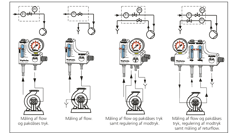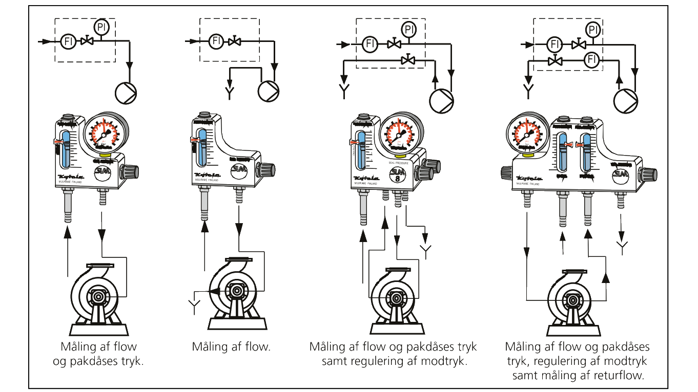 SLM fra Kytola fås til flere forskellige typer af pakdåser, som vist i nedenstående billeder. Grundlæggende har SLM altid et indbygget flowmeter med en integreret rensefunktion. Til flowmeteret er der tilknyttet en reguleringsventil så mængden af spærremedie kan reguleres. Du har også mulighed for at få et manometer monteret så du kan aflæse trykket i pakdåsen. Ydermere kan der monteres en reguleringsventil på tilbageløbet, hvorved modtrykket kan justeres, og du opnår dermed det korrekte tryk i pakdåsen. Der er ligeledes mulighed for at få en alarm monteret, så du er sikker på, at have det korrekte flow og derved køling og smøring af din pakdåse.