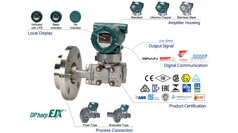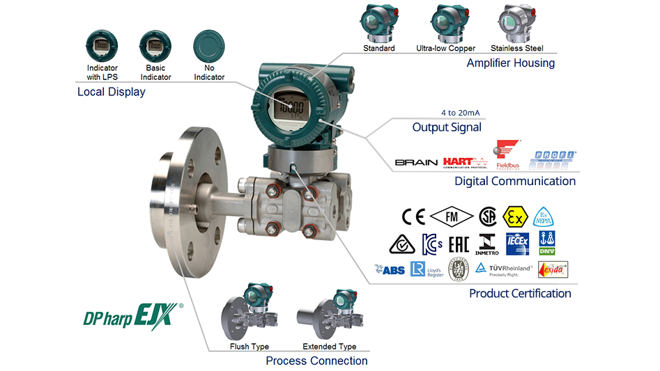 Yokogawa EJX210A high performance differenstryktransmitter med monteret flange forsats. Måleområde 10 mbar til 5 bar fordelt på to måleceller. En digital silicium resonans sensor, der sikrer høj nøjagtighed, stort turn-down og en fremragende langtidsstabilitet.