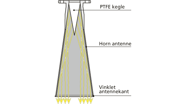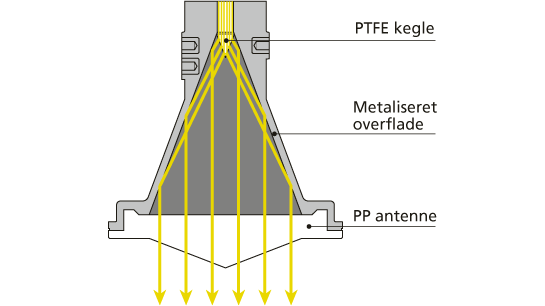 Billedet viser en antenne konstruktion, hvor selve antennen (PTFE keglen) sidder trukket tilbage, så eventuelle belægninger og væskeophobninger ikke sætter sig på selve keglen, men på PP antennen. Elektronikken sikrer at dette ikke har indflydelse på målingen.