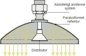 Billedet viser hvordan mikrobølgerne distribueres ud og rammer paraboloverfladen, hvorfra de sendes ned mod overfladen. På denne måde rammes et større areal, hvilket betyder højere refleksion selv ved medier med meget ujævn overflade.