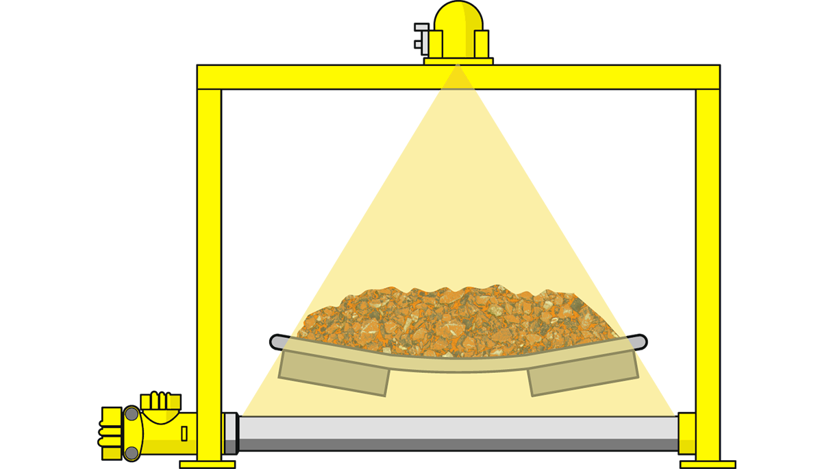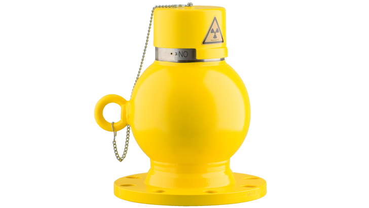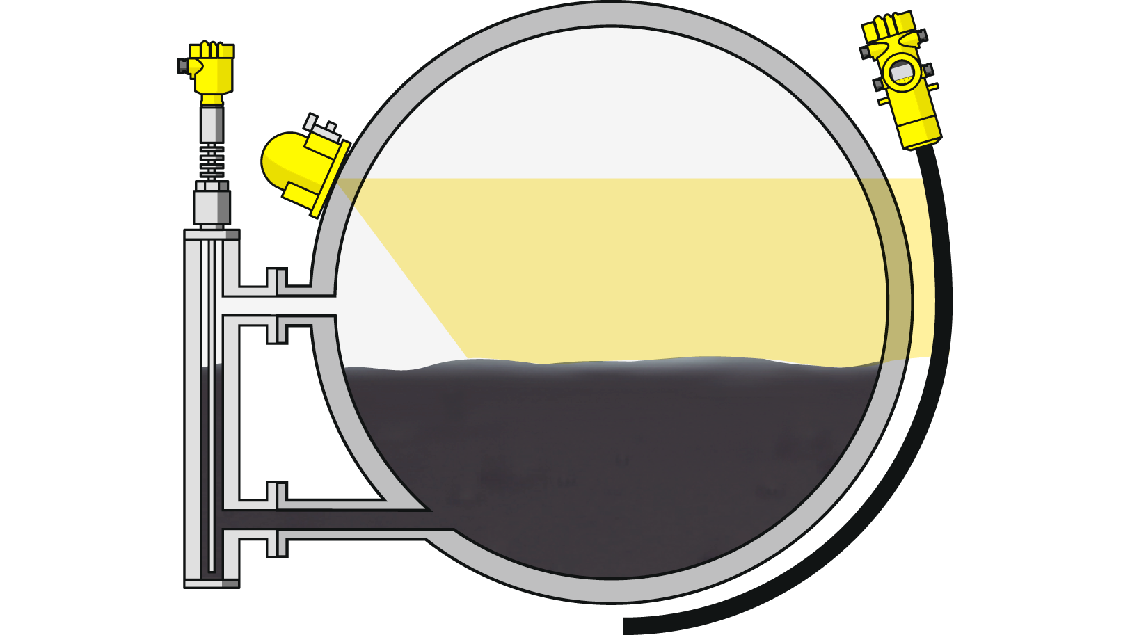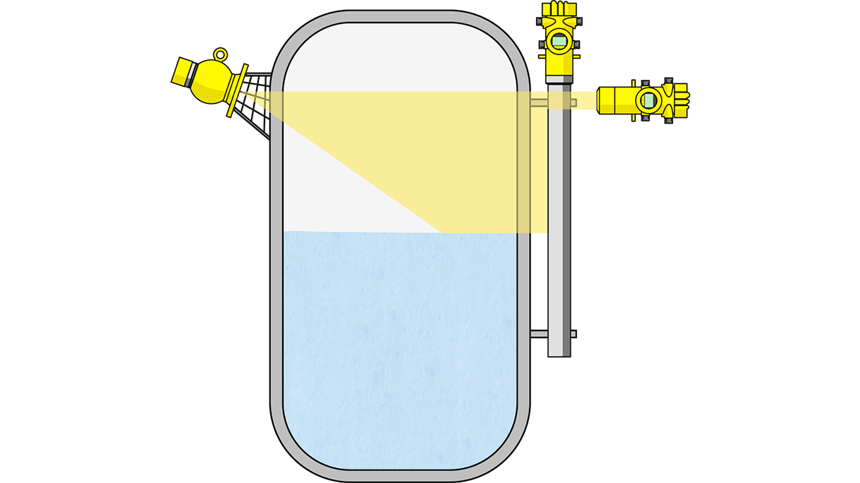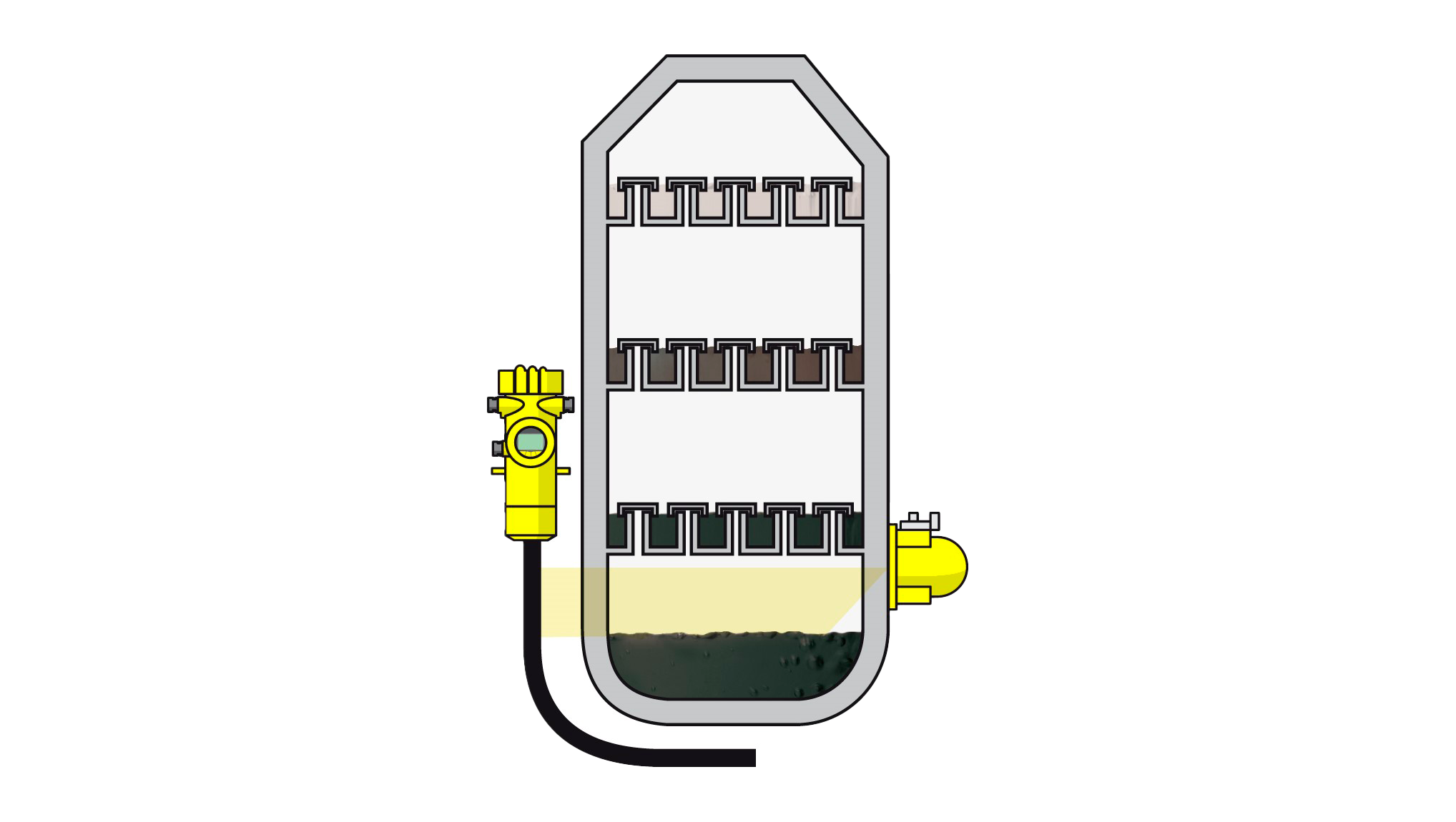 Billedet viser, hvordan en radiometrisk måling kan sidde i bunden af den destillations kollonne i en raffineringsproces.
