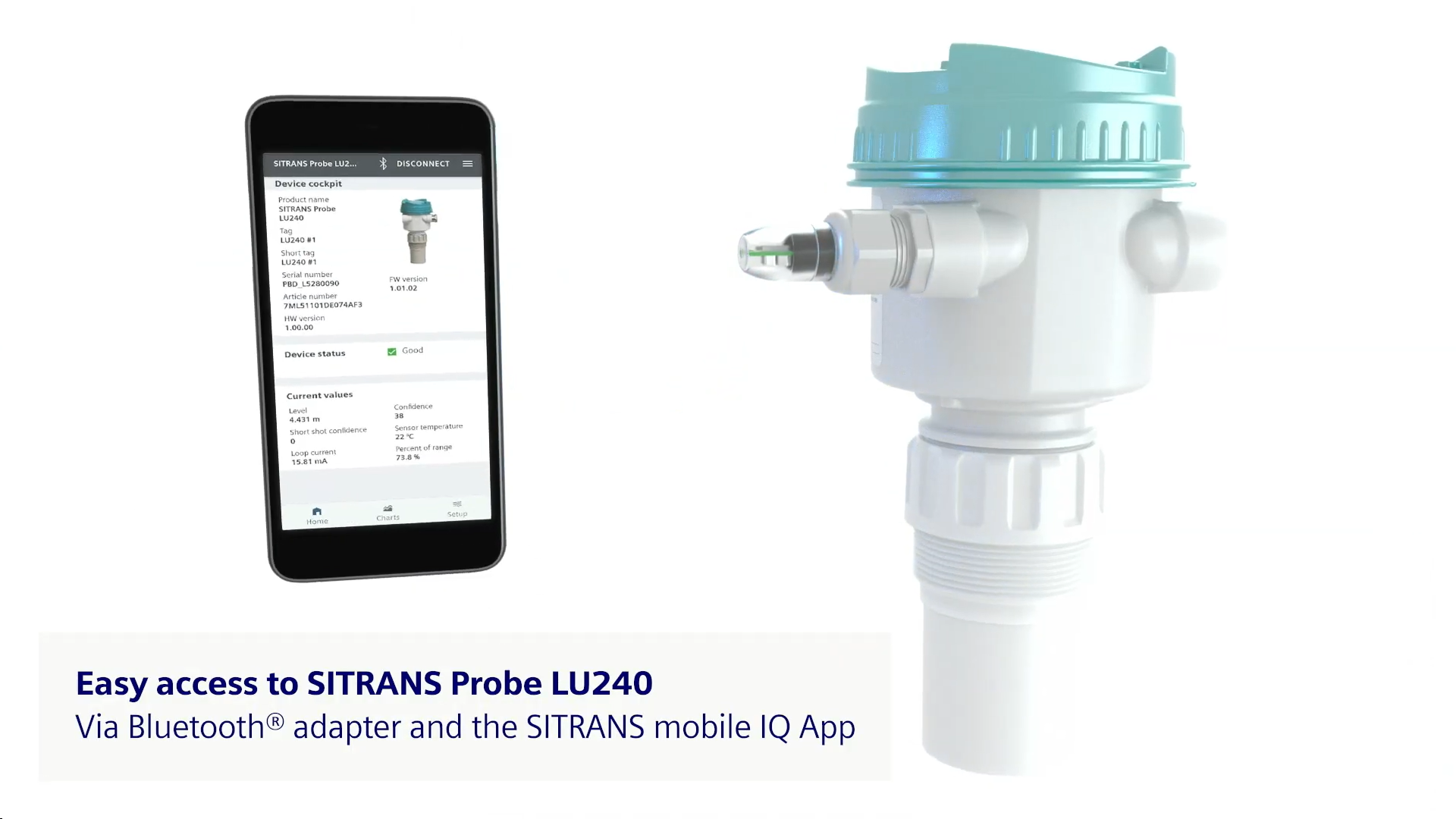SITRANS LU240 tilbyder mA-udgang samt HART-kommunikation (på visse modeller). Derudover kan du få Bluetooth via en valgfri adapter, så du nemt kan opsætte din niveaumåler med SITRANS mobile IQ appen, der giver dig en intuitiv grænseflade til hurtigt at konfigurere, opsætte og overvåge SITRANS LU240.
