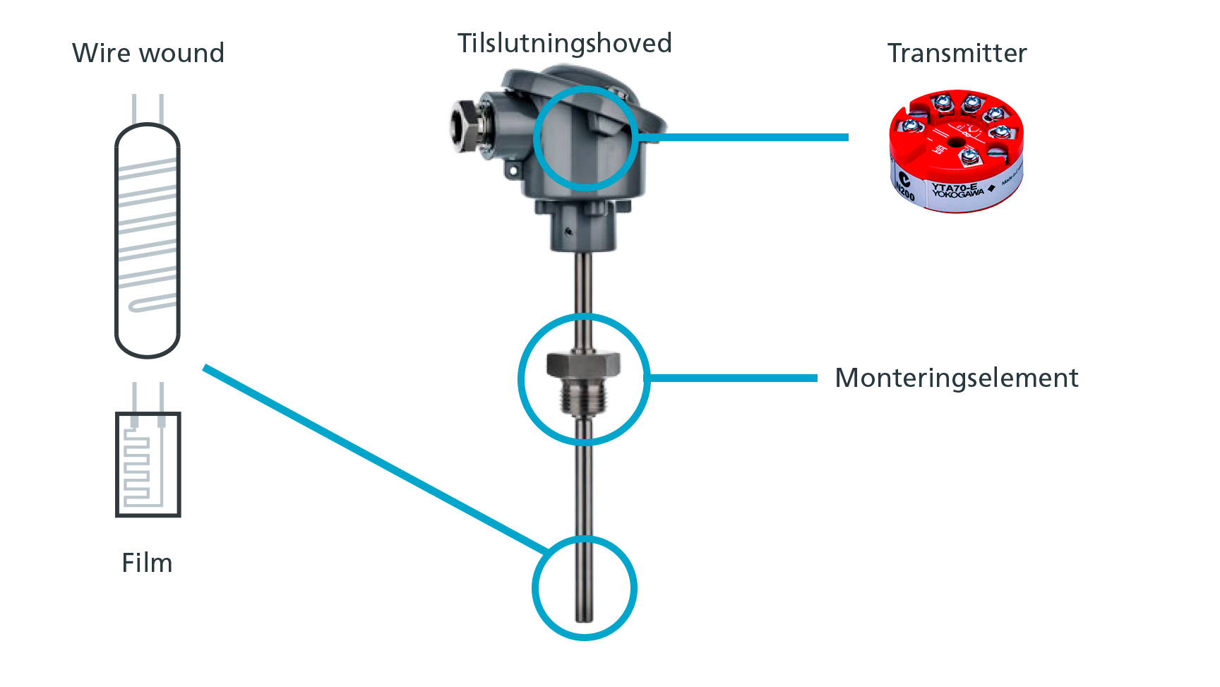 Føleren bliver for eksempel placeret i et metalrør, der går op i et tilslutningshoved. Fra føleren går der ledninger op gennem metalrøret til en transmitter i tilslutningshovedet. Transmitteren har derudover klemmer, så du kan tilslutte den til et eksternt kabel. Typisk har termometeret også en fitting, så du kan slutte det til din proces.