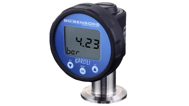 Den digitale trykindikator BAROLI 02P fra BD Sensors er med flush svejst rustfri stålmembran og er designet til applikationer med høje krav til hygiejne og sterilisation, hvor hygiejne og nem rengøring er afgørende.