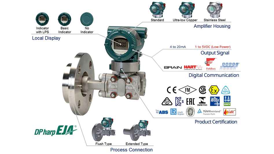 - Tilgængelig med HART 5/7, 1-5 V HART (loop power), FOUNDATION Fieldbus, PROFIBUS PA eller BRAIN kommunikation.