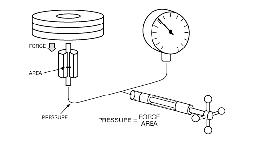 Den direkte relation Kraft (F) over areal (A), hvor kraften (F = m.g) er realiseret ved en masse (m) og forudsætter kendskab til den lokale tyngdekraft (g).