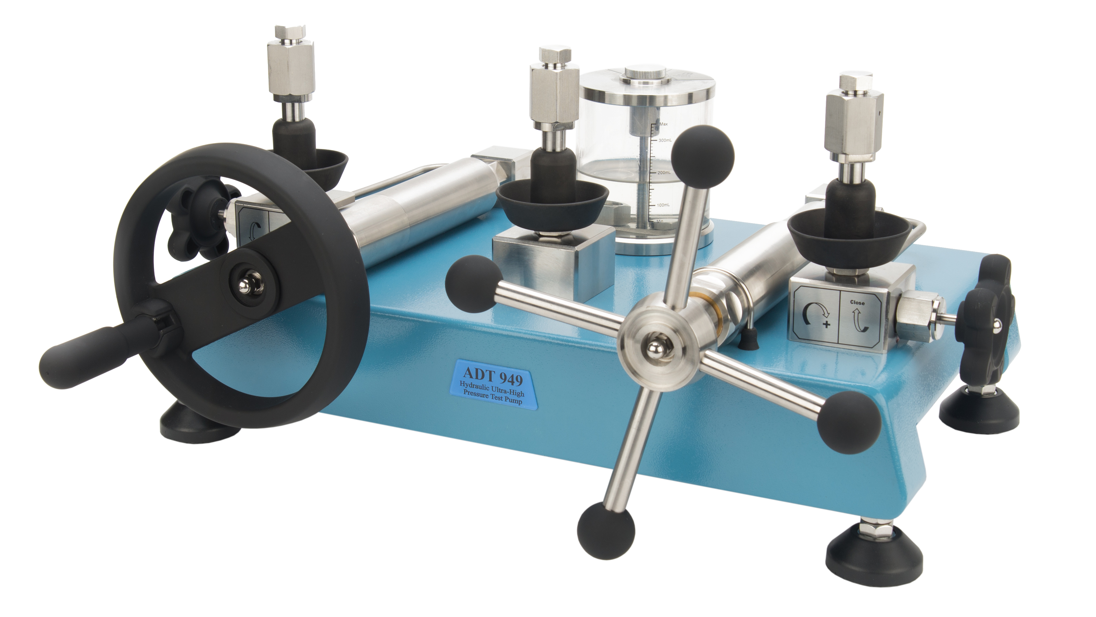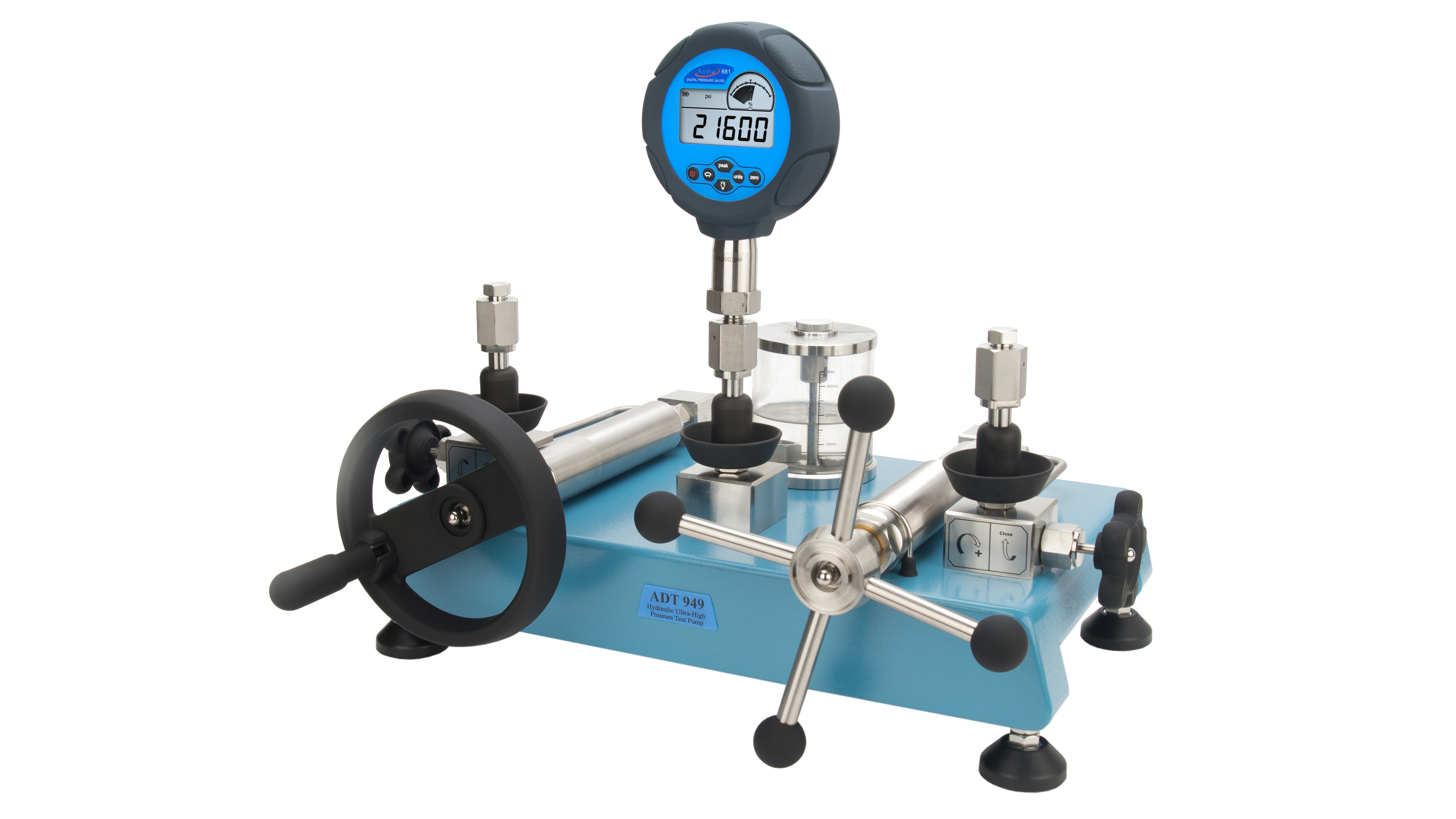Additel ADT949 er en hydraulisk håndpumpe til trykkalibrering med diethylhexyl sebacate, og kan generere tryk fra 85 % vakuum...2800 bar(g). Med sin patenterede skrueteknologi, er det nemt at generere højt tryk og regulere dette.