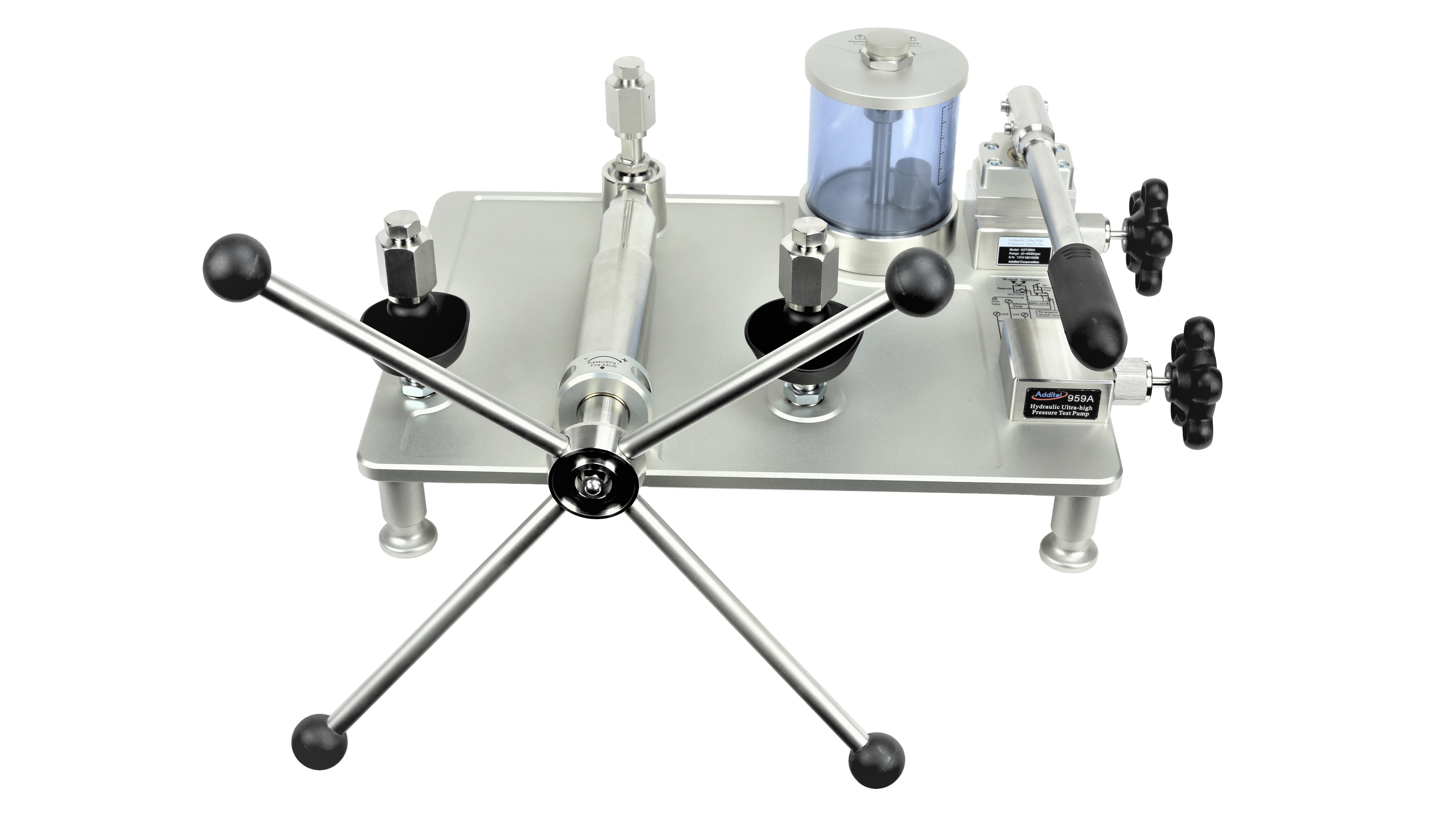 Additel ADT959A er en hydraulisk håndpumpe til trykkalibrering med diethylhexyl sebacate, og kan generere tryk op til 2800 bar(g). Pumpen er bygget op med et dobbelt stempel pumpe system til hurtig fyldning af større volumener.