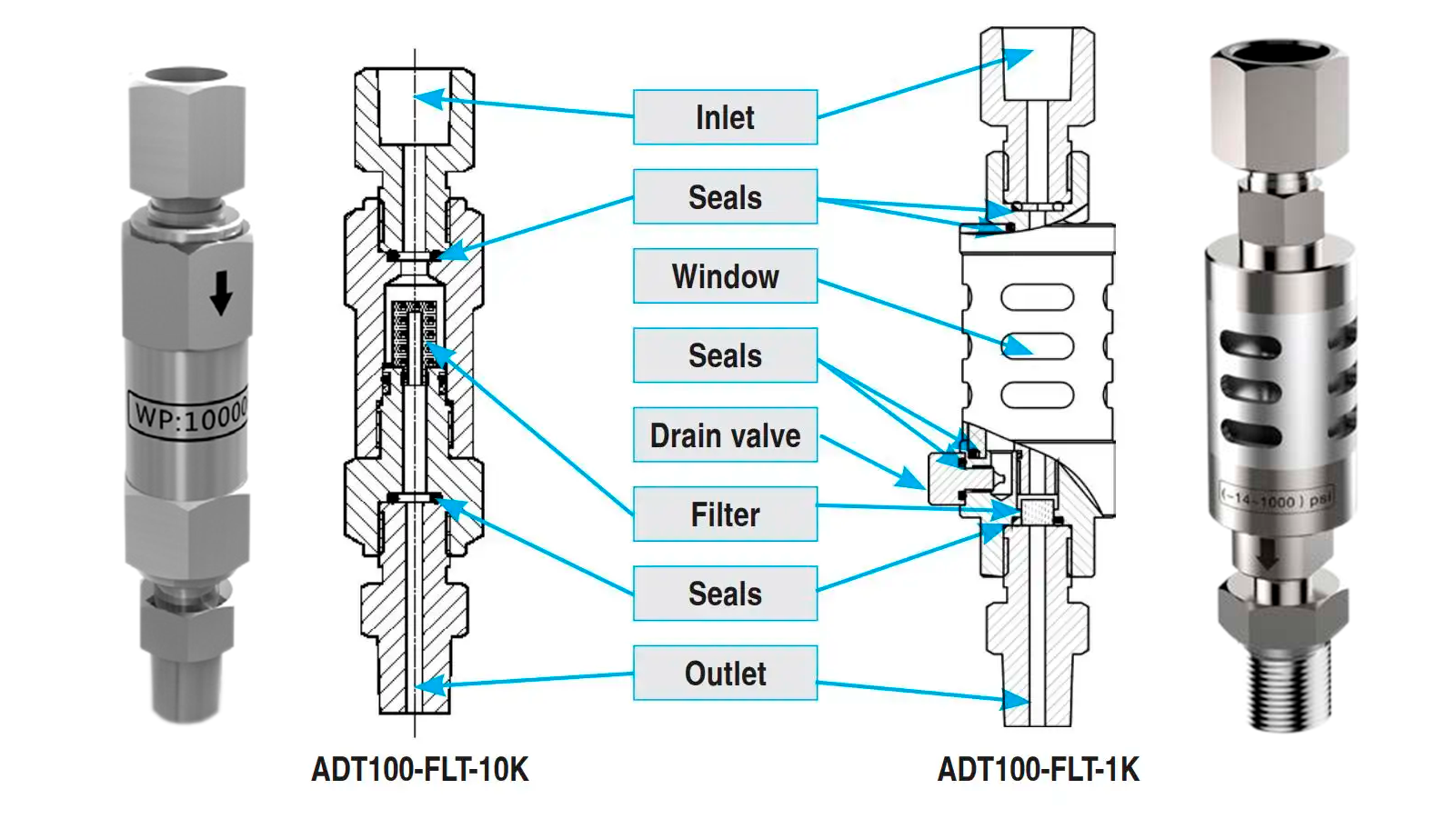 - ADT128: 1 tryk port med indbygget "moisture trap" til Additels transportable controller serie ADT760